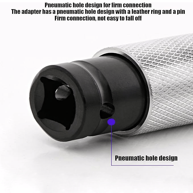 Zapewniając stabilną pracę, ten adapter klucza udarowego zapewnia ciągłe wsparcie dla zadań o wysokiej intensywności. Jego unikalna konstrukcja zapewnia bezpieczne połączenie ze skórzanym pierścieniem i sworzniem, utrzymując stabilność podczas długotrwałego użytkowania. Dzięki pneumatycznemu otworowi zapewnia solidny chwyt i stałe wsparcie podczas pracy.