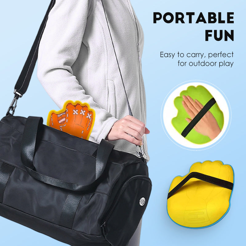 SOLIDNE, ANTYPOŚLIZGOWE KRĄŻKI DO DŁONI – większe, grubsze krążki do dłoni zapewniają pewny chwyt, a elastyczna gumka utrzymuje je na miejscu. Taka konstrukcja sprawia, że rzucanie i łapanie jest łatwe i przyjemne, zapobiega poślizgom i zapewnia bezproblemową zabawę podczas aktywnej gry.