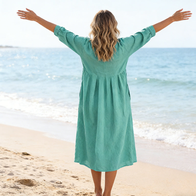 ELEGANT V-NECK DESIGN - Beautifully frames your neckline and collarbone, adding a subtle touch of sophistication. It allows for easy accessorizing with your favorite necklaces to complement the dress's relaxed, retro vibe.