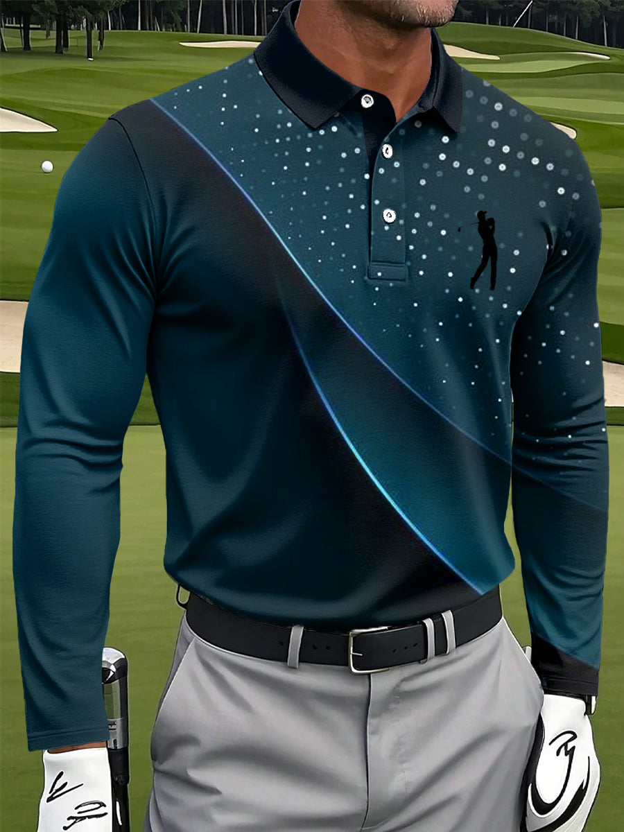 Męska błyszcząca patchworkowa koszulka polo z długim rękawem w stylu retro