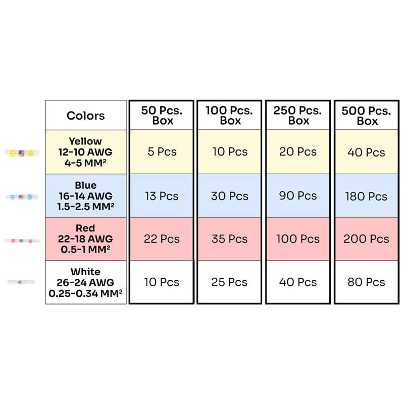 Rurki oznaczone kolorami ułatwiają wybór odpowiedniego rozmiaru złączki do każdego zastosowania. Zmierz przewód i wybierz odpowiednią złączkę, patrząc na tabelę rozmiarów na opakowaniu.